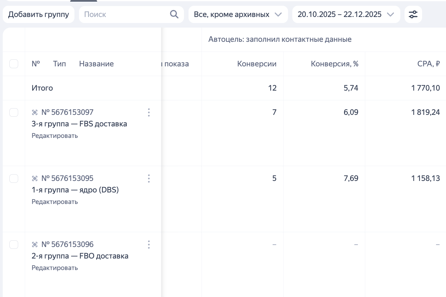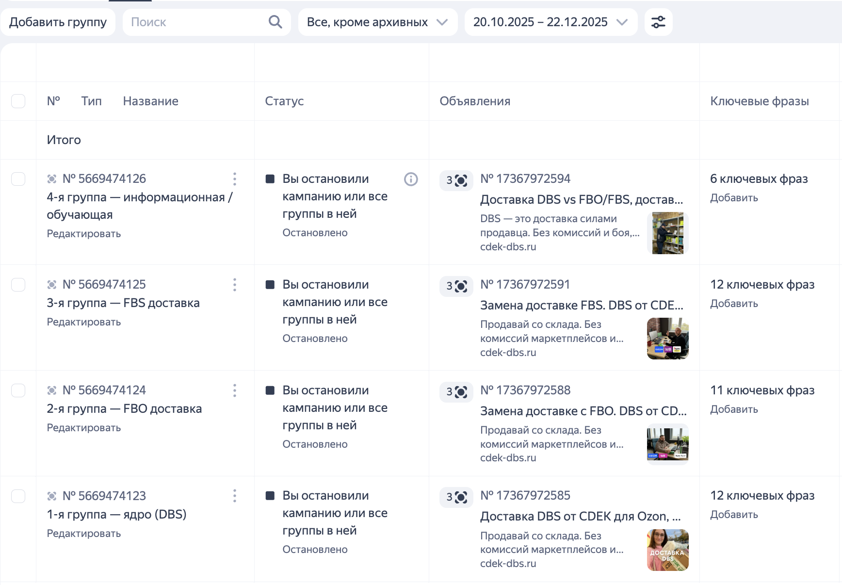 Параллельно шла работа над рекламной кампанией. На этапе проектирования я выделил 4 направления. Непосредственно DBS-доставка, конкурирующие с ней FBS и FBO доставки и информационные запросы (они после были убраны из рекламы). Под каждую группу были подобраны релевантные ключам заголовки и описание.